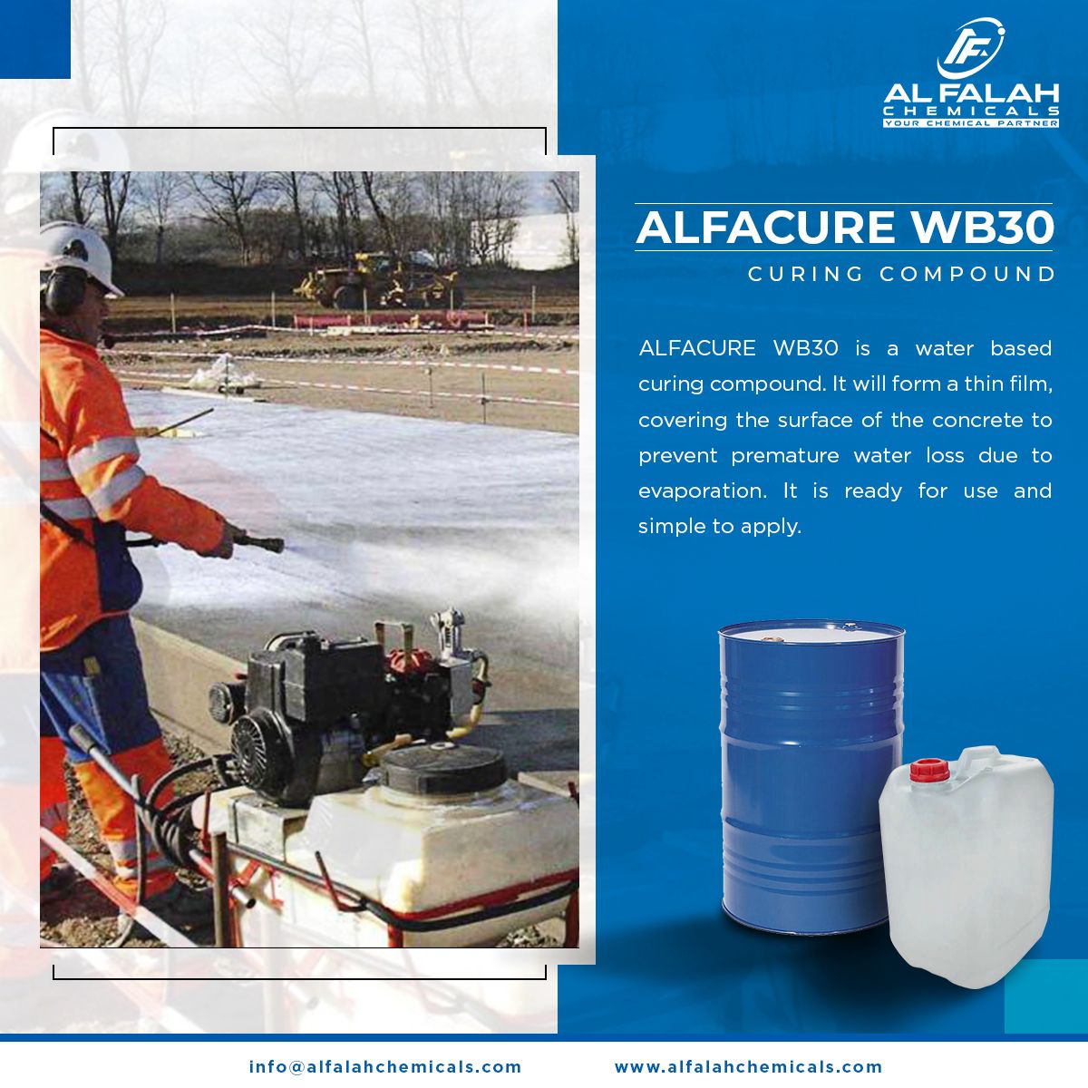 By retaining moisture within the concrete, Alfacure WB30 promotes effective cement hydration, enhances strength development, and reduces surface cracking. It is suitable for slabs, pavements, foundations, and other exposed concrete structures where proper curing is essential for long-term durability.